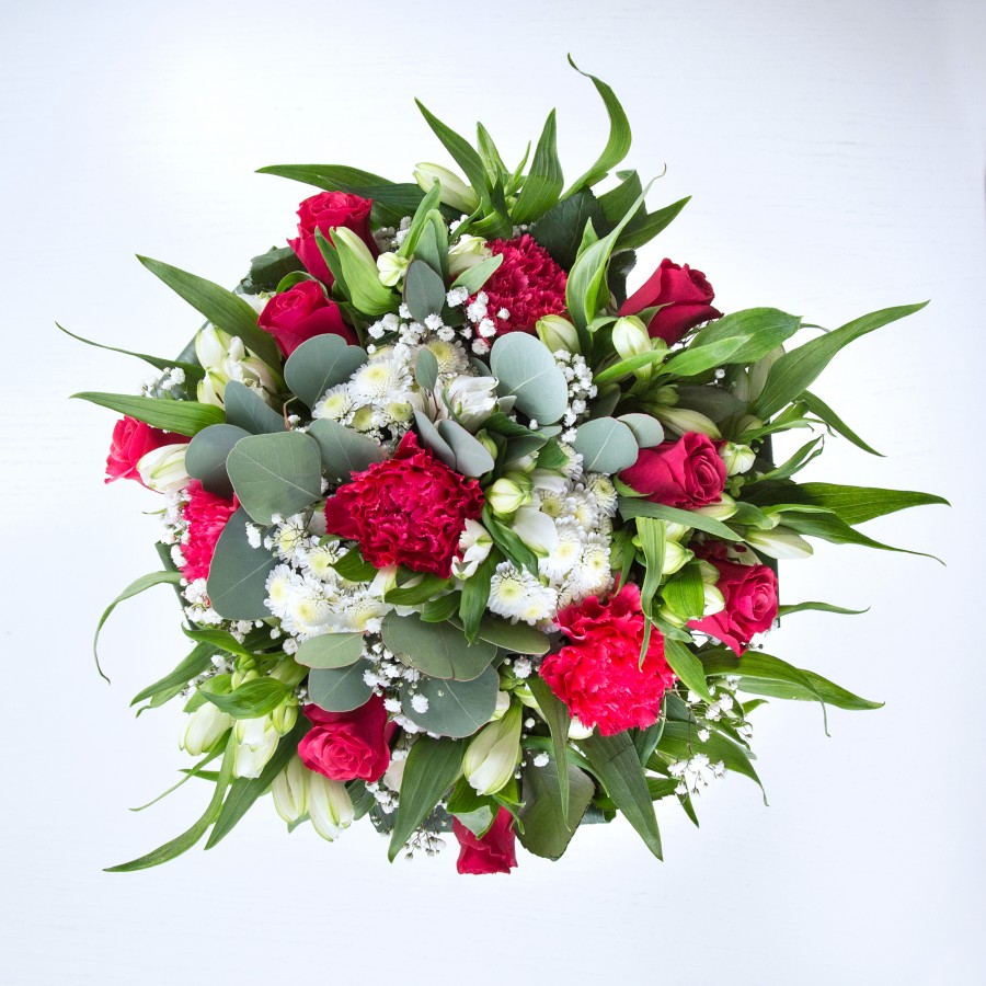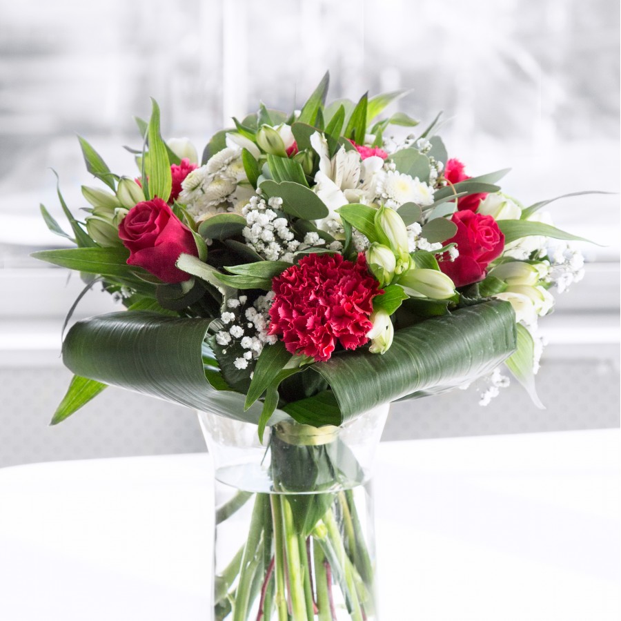 Discover the gorgeous blend of red and white flowers in our stunning arrangement. Featuring exquisite red roses, sweet white chrysanthemums, and delicate gypsophila, this bouquet is beautifully accented with carnations, white alstroemeria, and aspidistra leaves for a unique and elegant design.