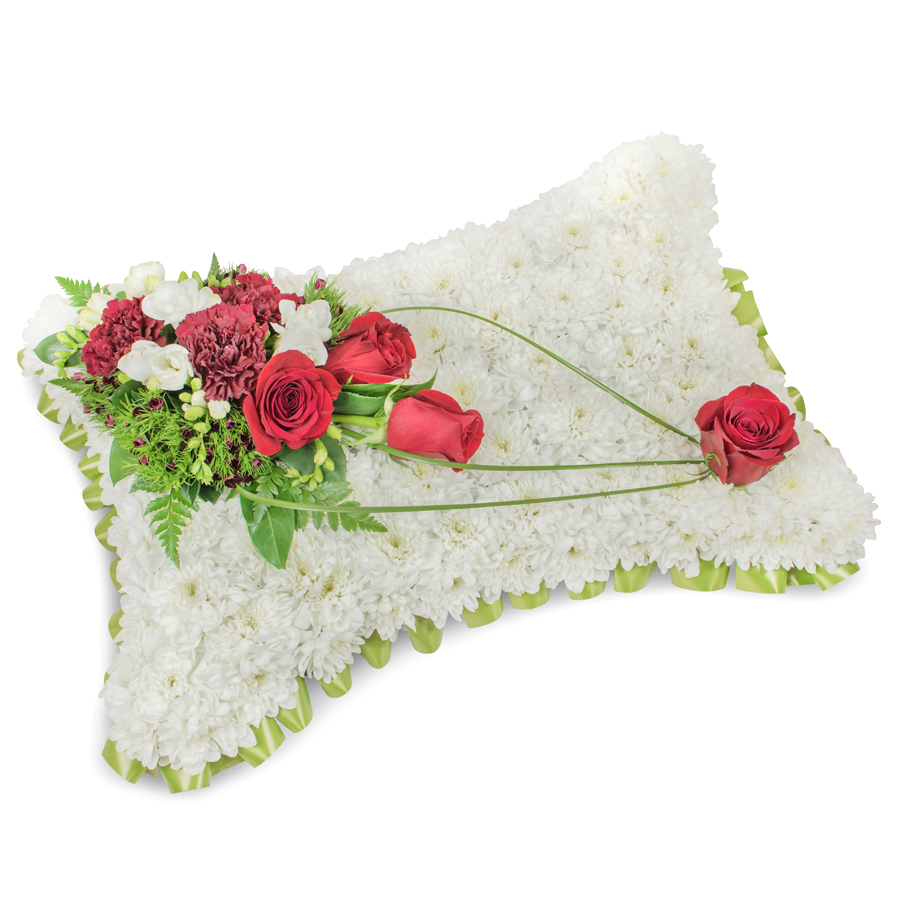 Offer your deepest sympathies with our elegant condolence arrangement, featuring a refined selection of white chrysanthemums, red roses, white freesias, and dark red carnations. Complemented by dianthus and bear grass, this bouquet showcases exquisite design and vibrant colors.